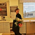 2024 Pia Harjula (kuvassa liiton puheenjohtajan Marja Väärälän palkitsemana) kotitalousopettaja, Kouvolan Inkeroisten yhtenäiskoulu
